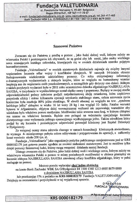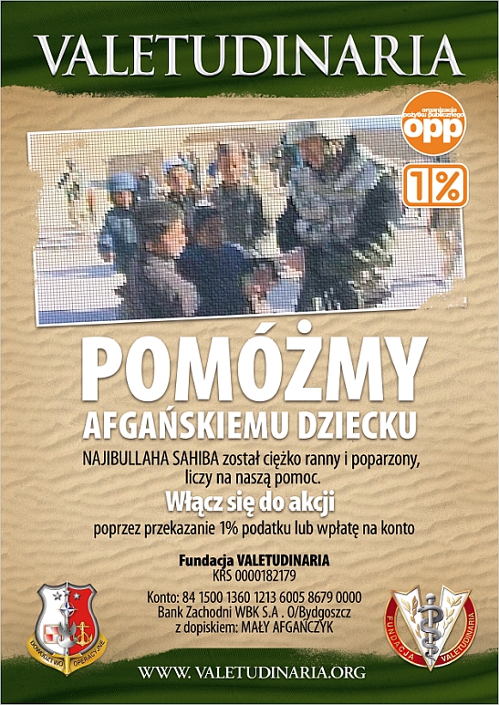Wszystkim darczyńcom bardzo dziękujemy. ![]() ![]() Fundacja "Valetudinaria" na wniosek Dowództwa Operacyjnego Rodzaju Sił Zbrojnych RP, mając na uwadze opinię o Wojsku Polskim i Wojskowej Służbie Zdrowia dwa razy wspierała leczenie afgańskiego policjanta kapitana Ahmed ZIYA, który jako dowódca posterunku w Khwajah Omari wielokrotnie ochraniał naszych żołnierzy w Afganistanie i w wyniku ataku rebeliantów na bazę doznał urazu kończyn dolnych. Dzięki naszym kolegom lekarzom służącym w Afganistanie udało się uratować życie i przygotować rannego po częściowej amputacji obu kończyn do zaprotezowania kończyn w Polsce. O protezowaniu kpt. Ahmada Zii można było przeczytać w nw. artykułach:
